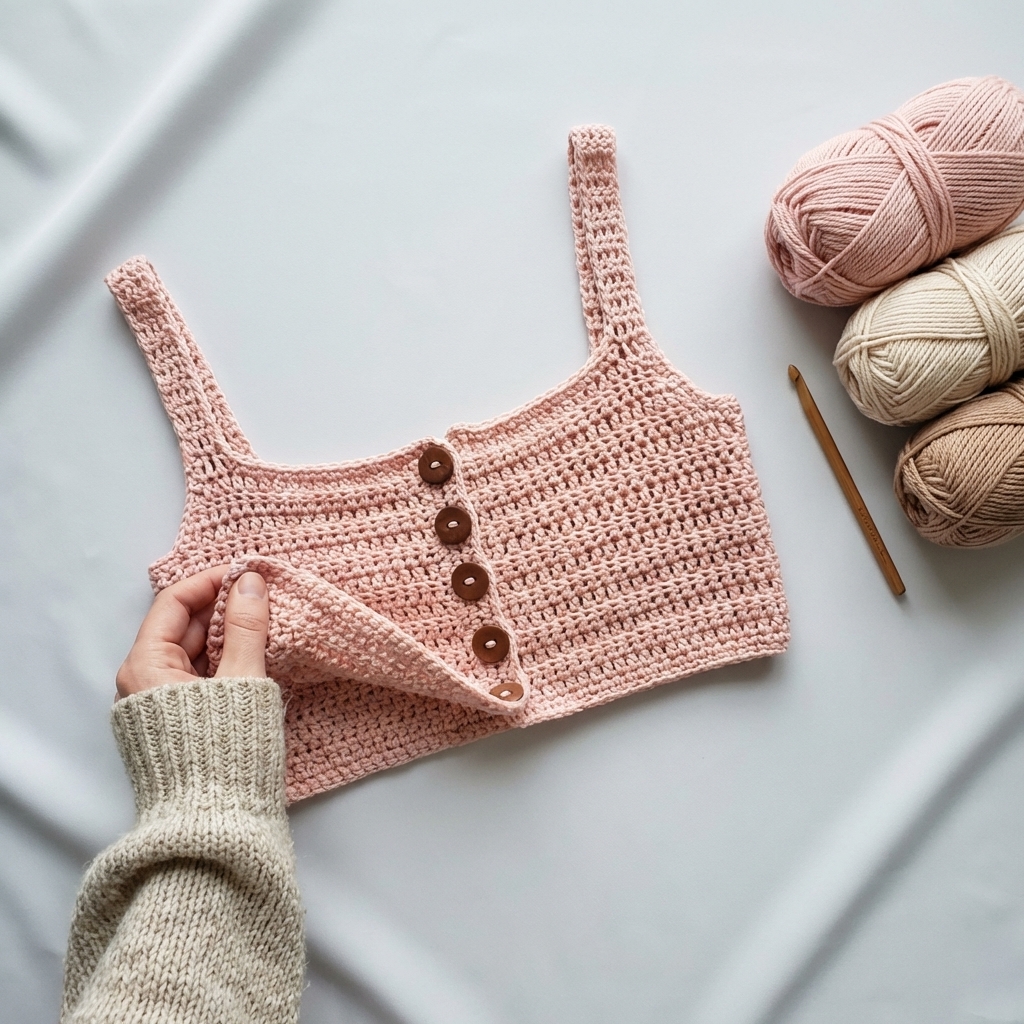 Crocheting this delightful tie-top bralette is easy; all you need is a 5mm crochet hook, stitch marker, yarn needle, four to five buttons, and your choice of cotton yarn. For step-by-step instructions and guidance, check out this article.