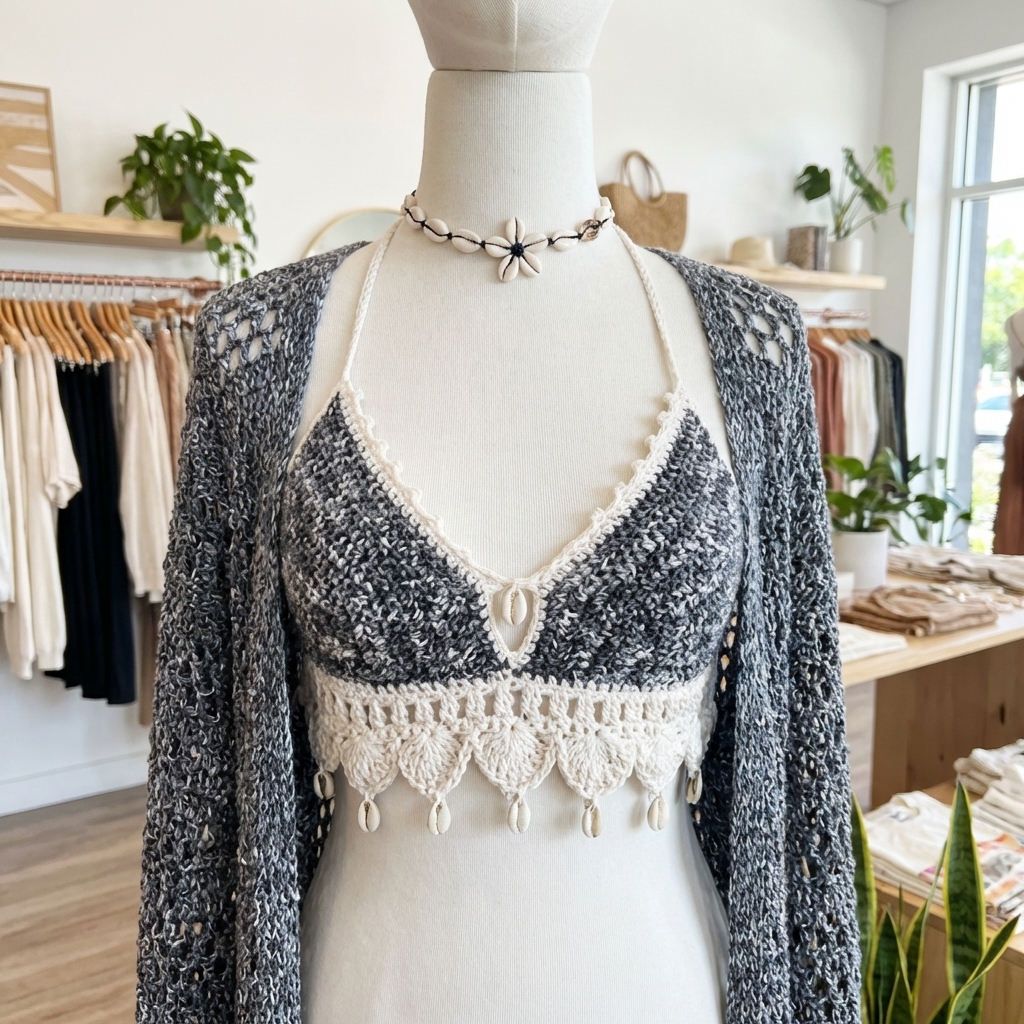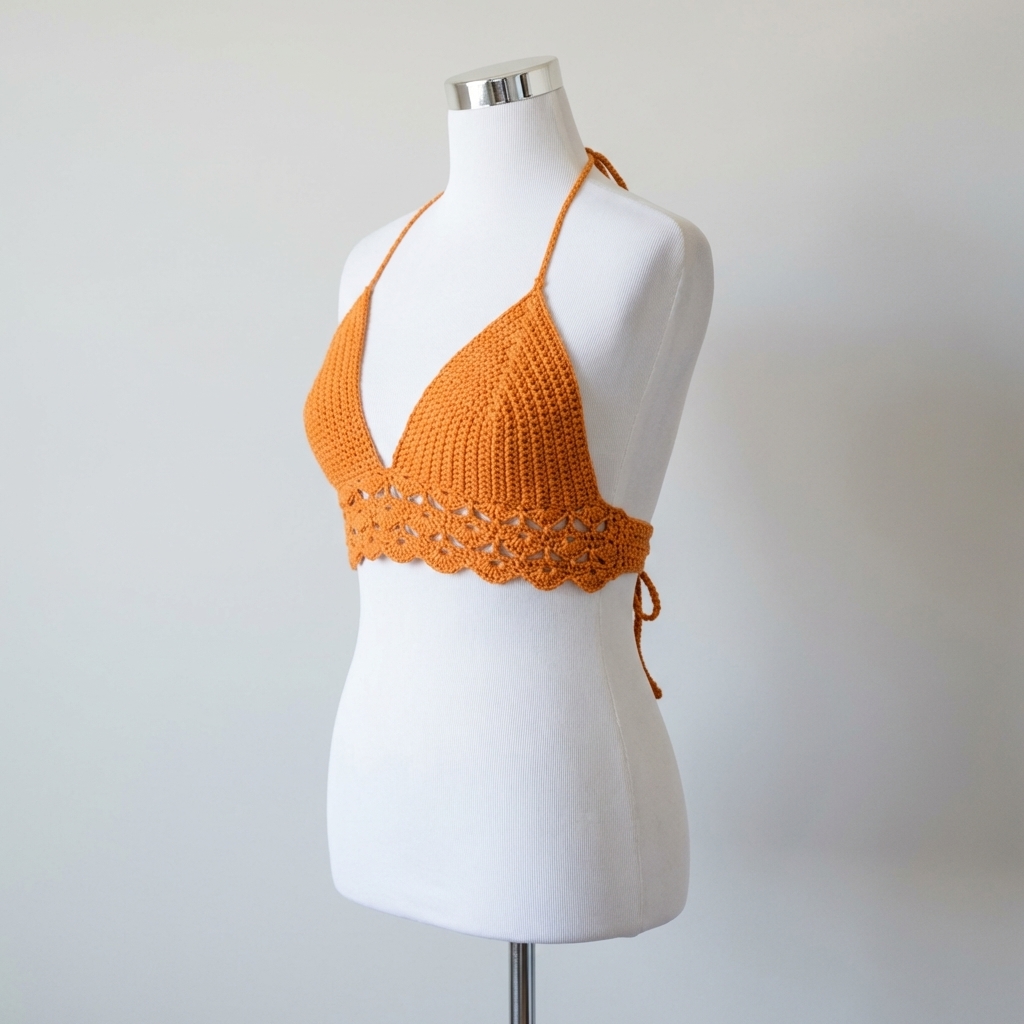 Show off your creativity with this crocheted bralette, featuring a scallopedic bottom, cascading backside, and lovely tiny metal accents. Crafted with natural fiber yarn and a 3.5mm crochet hook, it stands out as a statement piece in your summer collection.