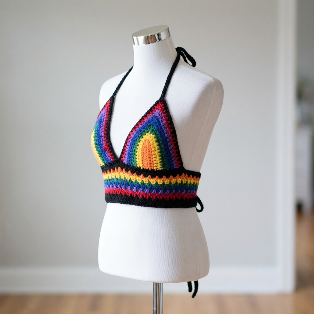 Capture the spotlight at your next beach party with this eye-catching rainbow-fringed crochet bralette. This delightful creation is not only easy to whip up but also very budget-friendly, making it a must-have for your summer outings.