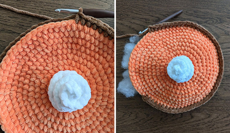 Round 1: Attach the yarn to any stitch of your choice, chain 1, and single crochet in the same stitch. Proceed to single crochet around the circumference, attaching the filling to the crust as you go. Once finished, make sure to stuff the pie to your desired fullness. After you close the pie, this round should maintain a total of 72 stitches.