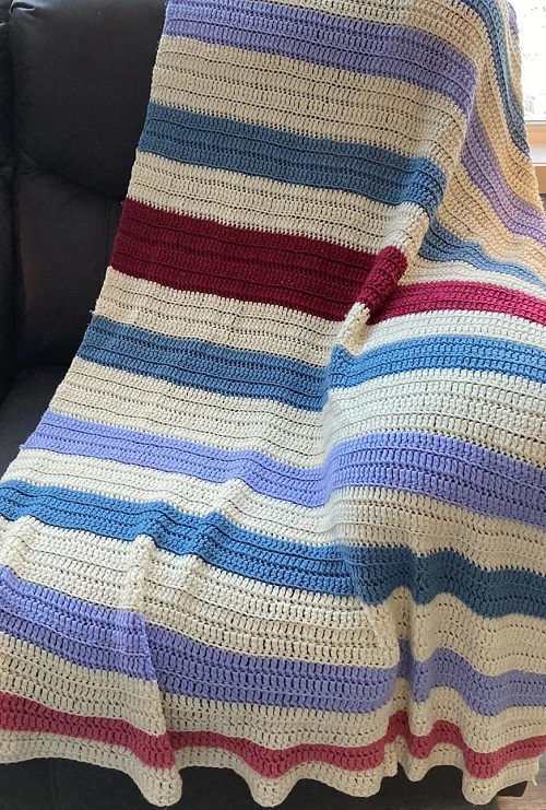 If you believe that scrap yarn blankets are less than appealing, take a look at this beautifully designed crocheted afghan that will change your perspective. This project makes excellent use of different colored yarn scraps, resulting in a stunning finished product that can be a centerpiece in your home.