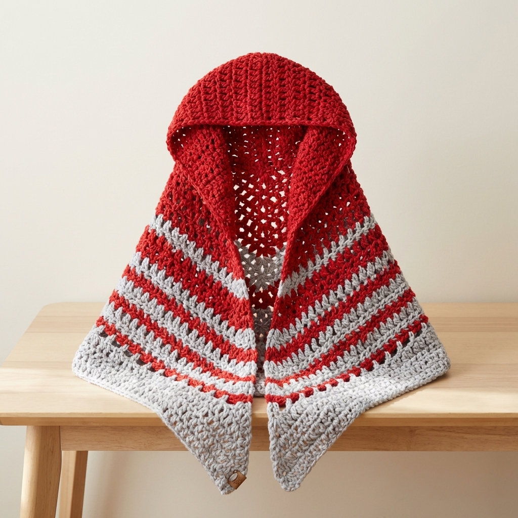 The dual-toned hooded shawl is crafted in a V shape, using two complementary yarn colors, a 7mm hook, tapestry needle, and a measuring tape. This versatile shawl pairs wonderfully with both everyday casual wear and festive outfits, giving you ample choices to style it with any look.