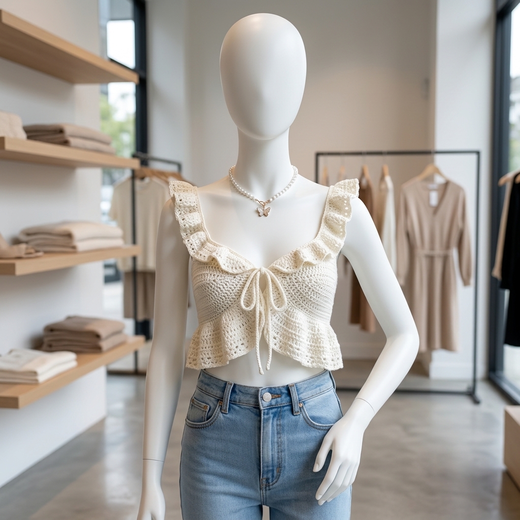 Learn to crochet this charming bralette ruffle top using only a chain, single crochet, double crochet, half double crochet, slip stitch, increase, and back loop techniques. Pair it with a crystal pendant and denim jeans for a cute and trendy ensemble.
