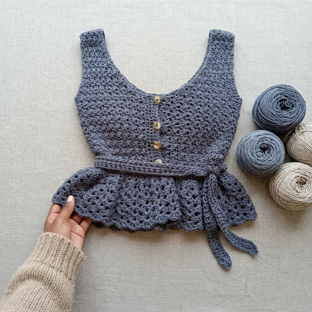 Stay comfortable and stylish during summer gatherings with this crocheted belted ruffle top. It’s a fun project that can be completed in just two days by those with basic crochet skills.