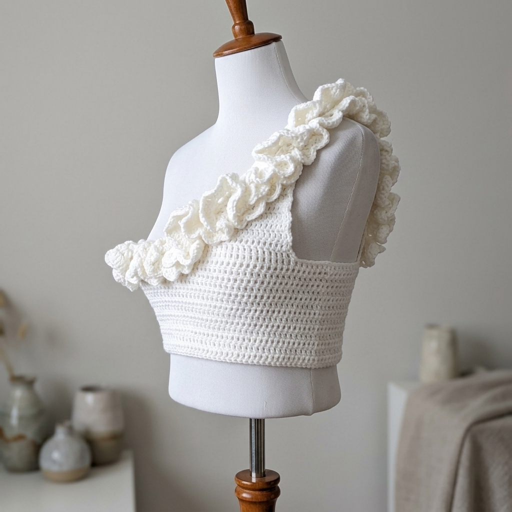 Follow this guide to create an elegant off-the-shoulder ruffle top. Begin with the side panels, working in one continuous piece. This top pairs beautifully with long skirts or bell bottoms for a contemporary yet timeless look.