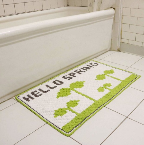 Tae’s bath mat incorporates greenery into your bathroom decor. Crafted diagonally from corner to corner using double crochet and chains, this bath mat is a refreshing addition, perfect for stepping onto after a soothing shower.