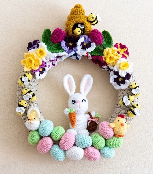 The 14-in-1 wreath pattern by Nicole Riley is a delightful creation featuring bunnies, carrots, a basket, eggs, bees, a beehive, baby chicks, and flowers. Crafted with worsted yarn and using essential crochet stitches, this wreath is a vibrant addition to any spring decor.
