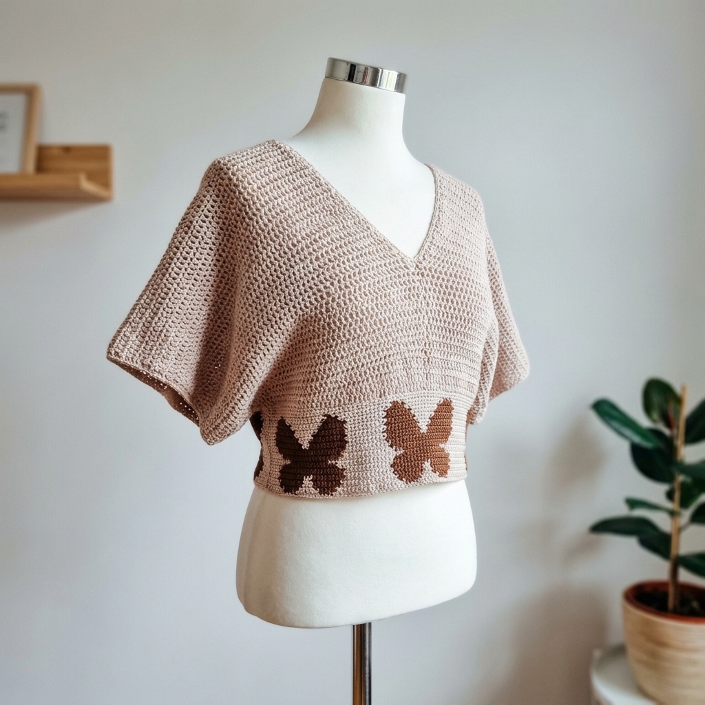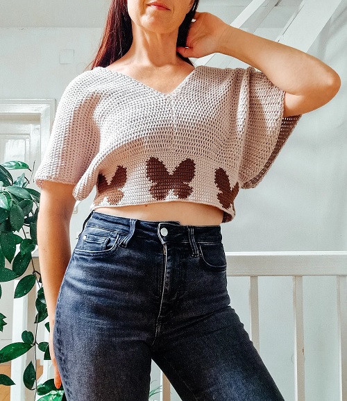 Craft a stunning and breezy crop top adorned with delicate motifs around the waist. With guidance from Loops Only, learn to create this charming piece featuring wide sleeves and a dramatic V-neckline on both sides. Ideal for warm weather, this pattern pairs effortlessly with jeans, skirts, or any wardrobe staples to create a chic and casual look.